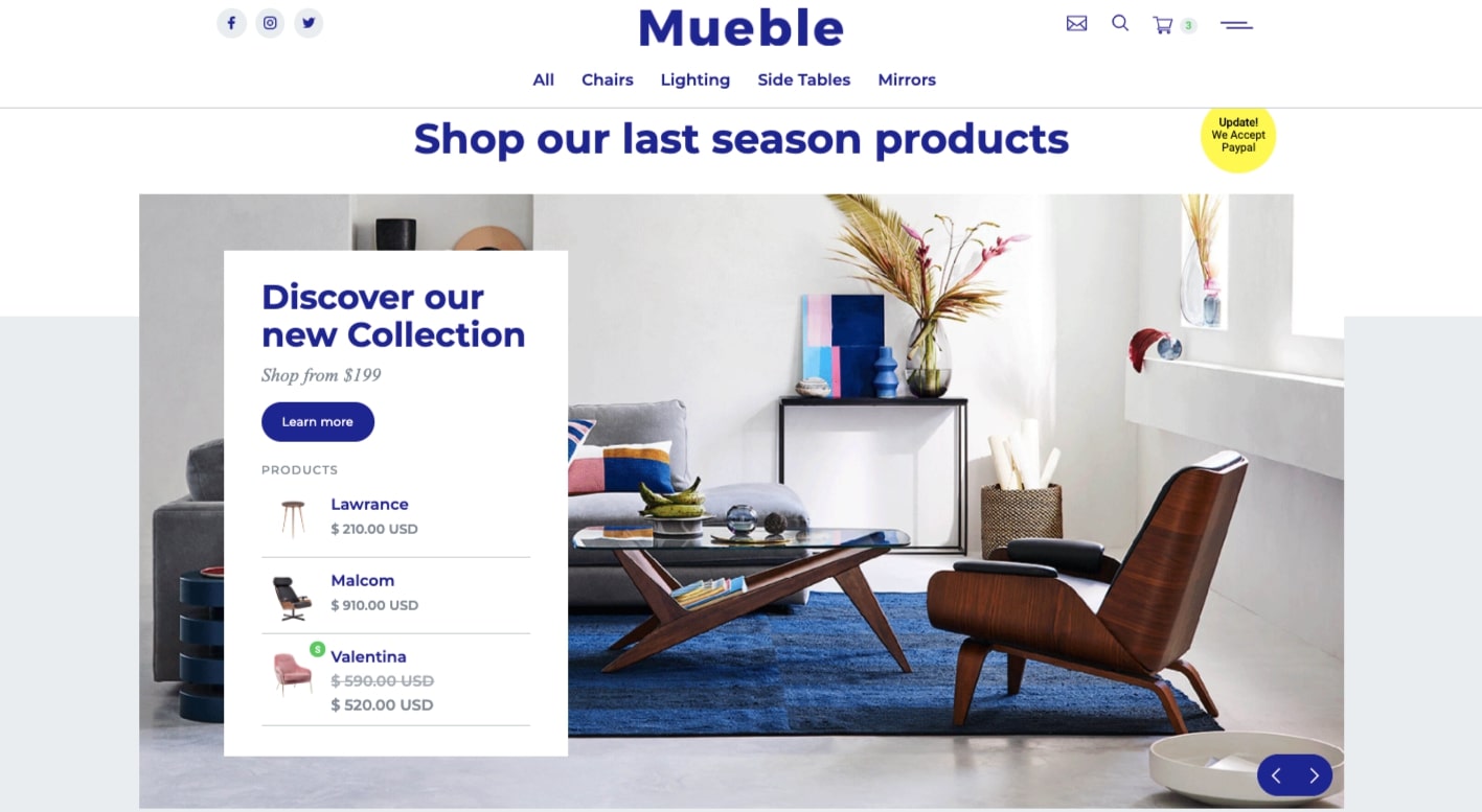 Mueble packs a variety of visuals. It features layered images and scroll-triggered animations, including a nice fade in effect applied to product images. Each scroll down into a new section reveals an animated transition, which effectively divides up page content.
