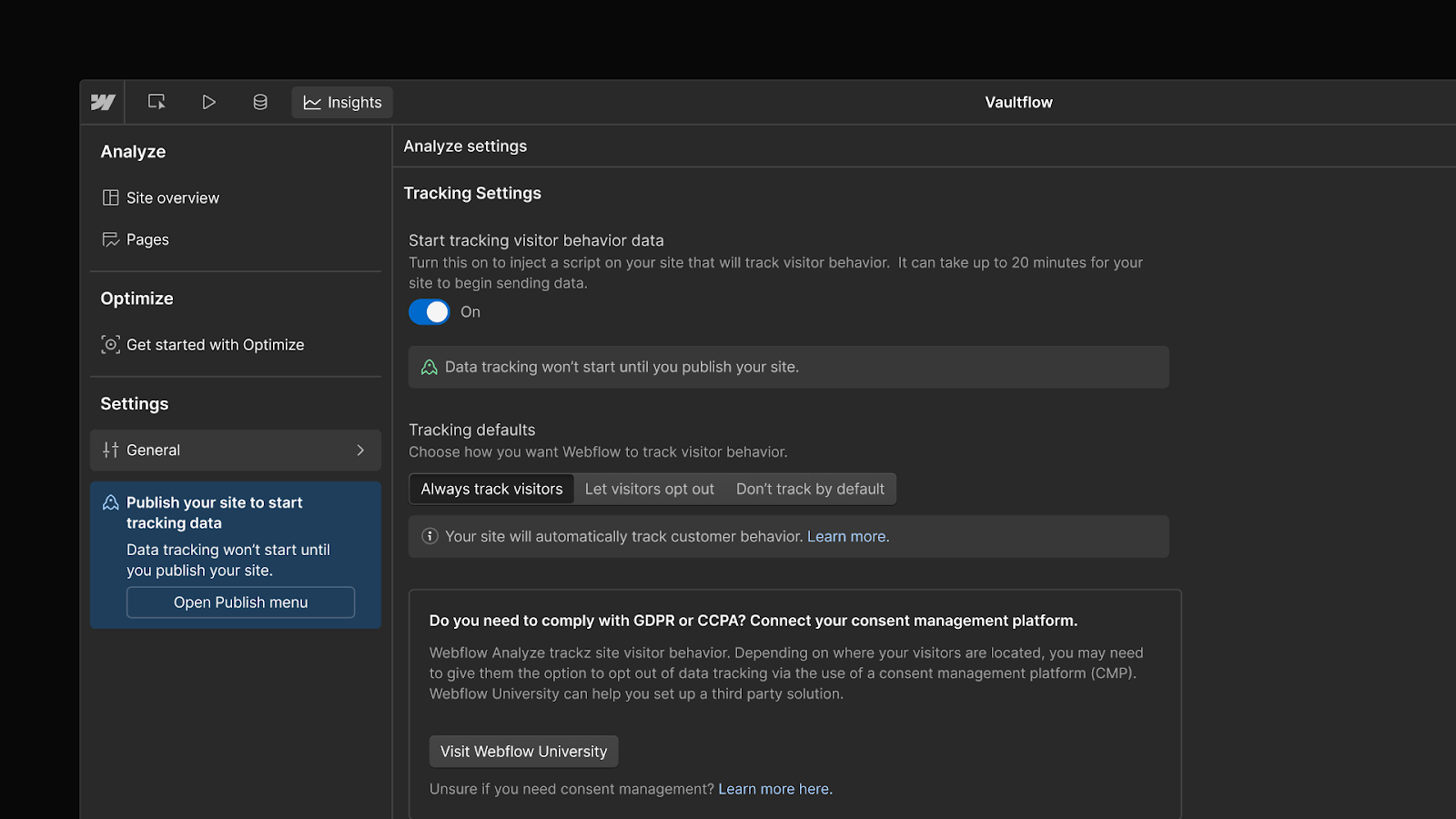 - The visitor data you need, right where you need it. Analyze offers easily digestible site and page insights right within Webflow, so you don’t need to switch between tools or navigate confusing third-party dashboards. You can even access analytics data while you build –right within whatever page you’re working on.