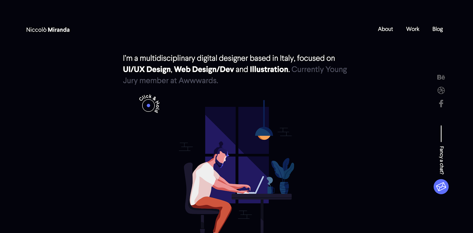 Webflow-using designer Niccolò Miranda has also put the cursor to more creative work than pointing and clicking on his portfolio site. On his homepage, the cursor cues you to click and hold, triggering a witty animation of him hard at work throughout the day.