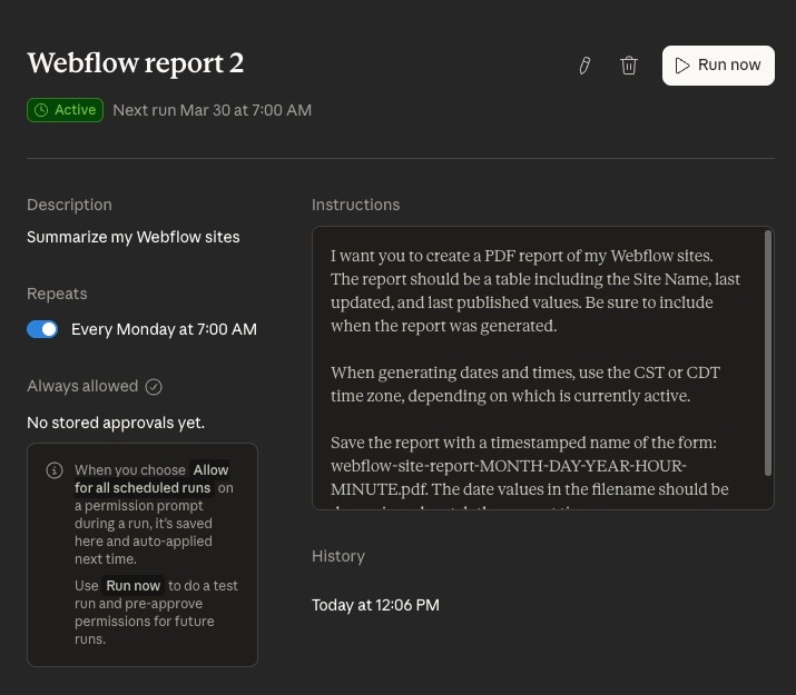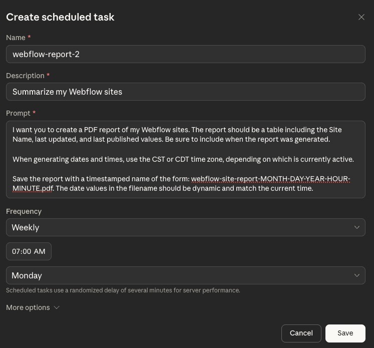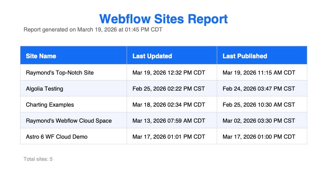 I want you to create a PDF report of my Webflow sites. The report should be a table including the Site Name, last updated, and last published values. Be sure to include when the report was generated.I passed this to Claude and let it work. Not surprisingly, it worked well, but the times returned were in UTC. I modified my prompt to handle this, using CST/CDT for a preferred timezone: