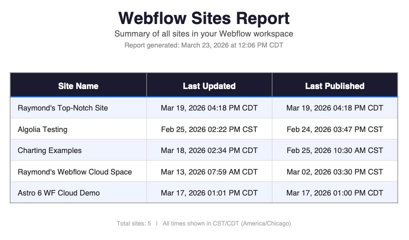 I want you to create a PDF report of my Webflow sites. The report should be a table including the Site Name, last updated, and last published values. Be sure to include when the report was generated.When generating dates and times, use the CST or CDT time zone, depending on which is currently active. That last bit was important as initially I only asked for CST, got times that were an hour off, and remembered daylight savings. (Idea for my next prompt: how I can help advocate for the removal of daylight savings?)