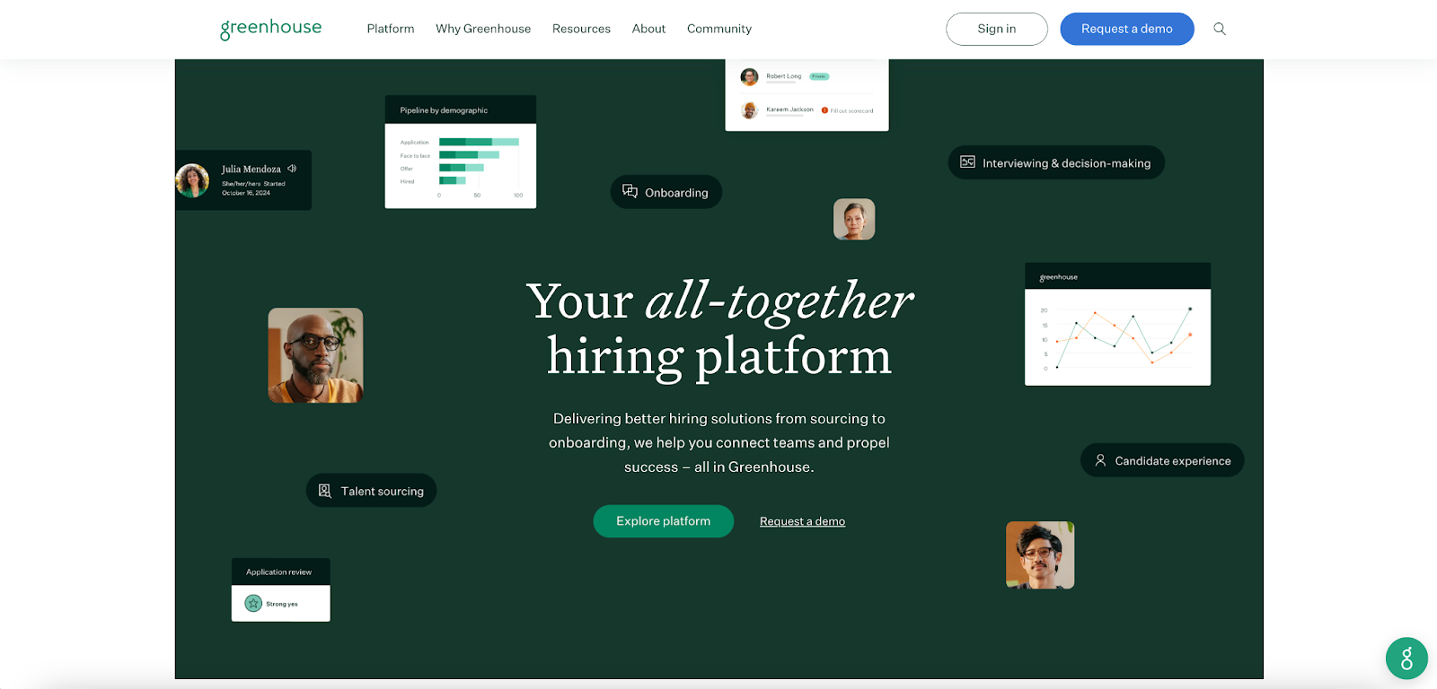 Alluding to how disparate the hiring process can be for all parties, Greenhouse conveys the concept of unity in their value proposition in two different ways. The all-together phrasing emphasizes not only connecting various teams to propel success, but also acknowledges that with their solution, the hiring process (from sourcing to onboarding) is seamless from start to finish.