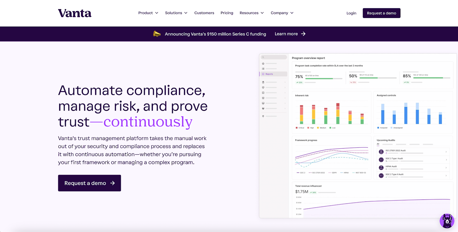 Security and compliance platform, Vanta, communicates exactly what prospective customers can expect to achieve with their tool. Vanta uses a simple structure to make its value proposition as clear and concise as possible.