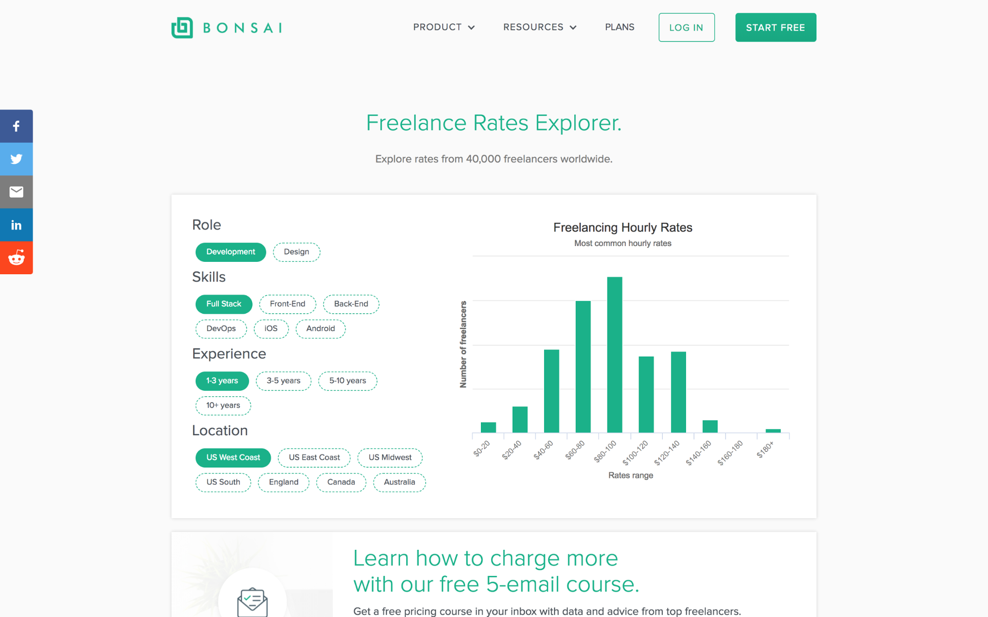 Bonsai gets bonus points for creating an impressive resource hub for freelancers. They share survey data about rates, best tools for freelancers, and the top places to find new work.