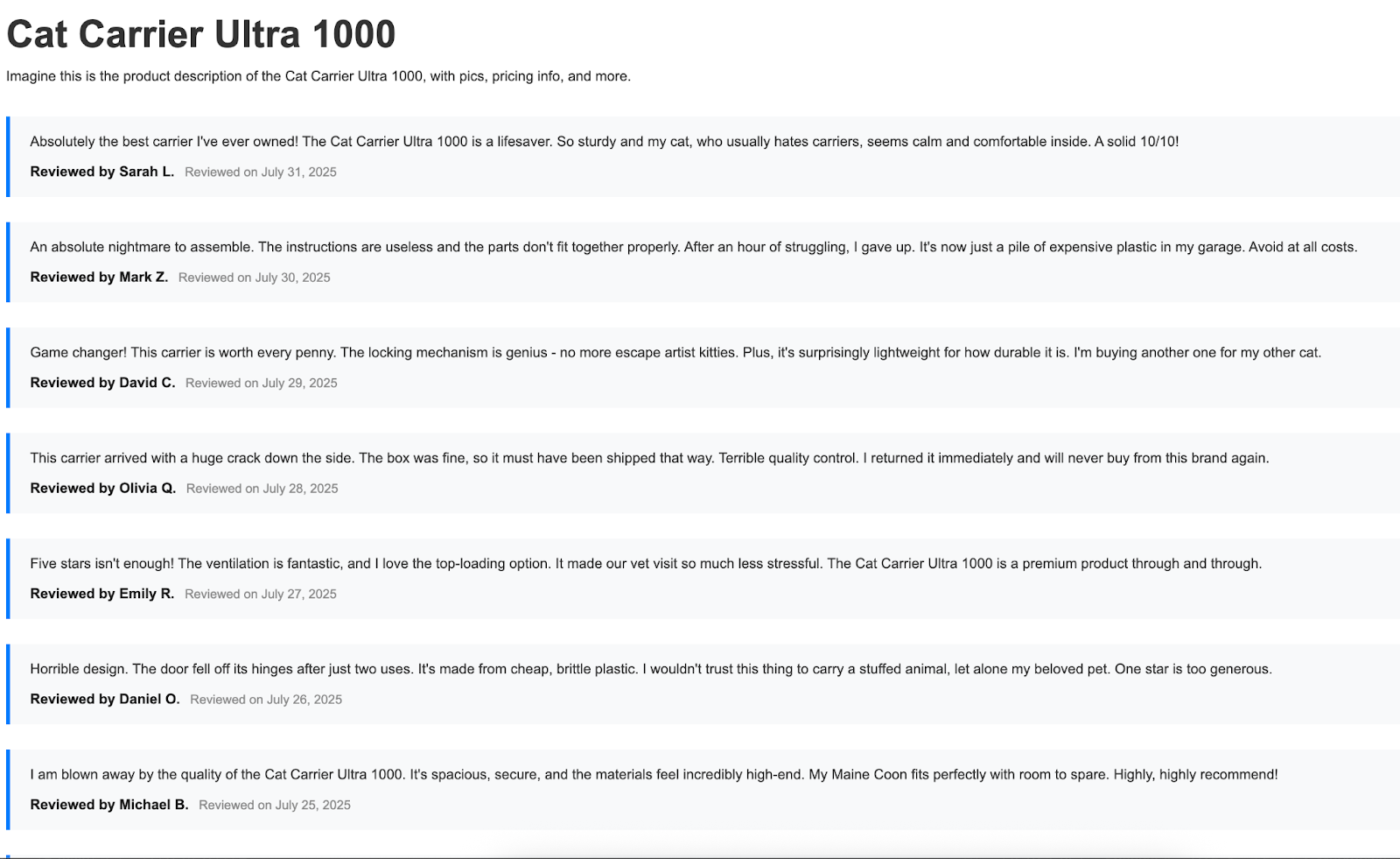 On my site, I created a page and added a Collection List component tied to my reviews, sorted by the date when the review was created. I did a bit of design work in the Collection Item block to nicely render each review with a blue border to the right. You can see this for yourself here, but here's a screenshot: