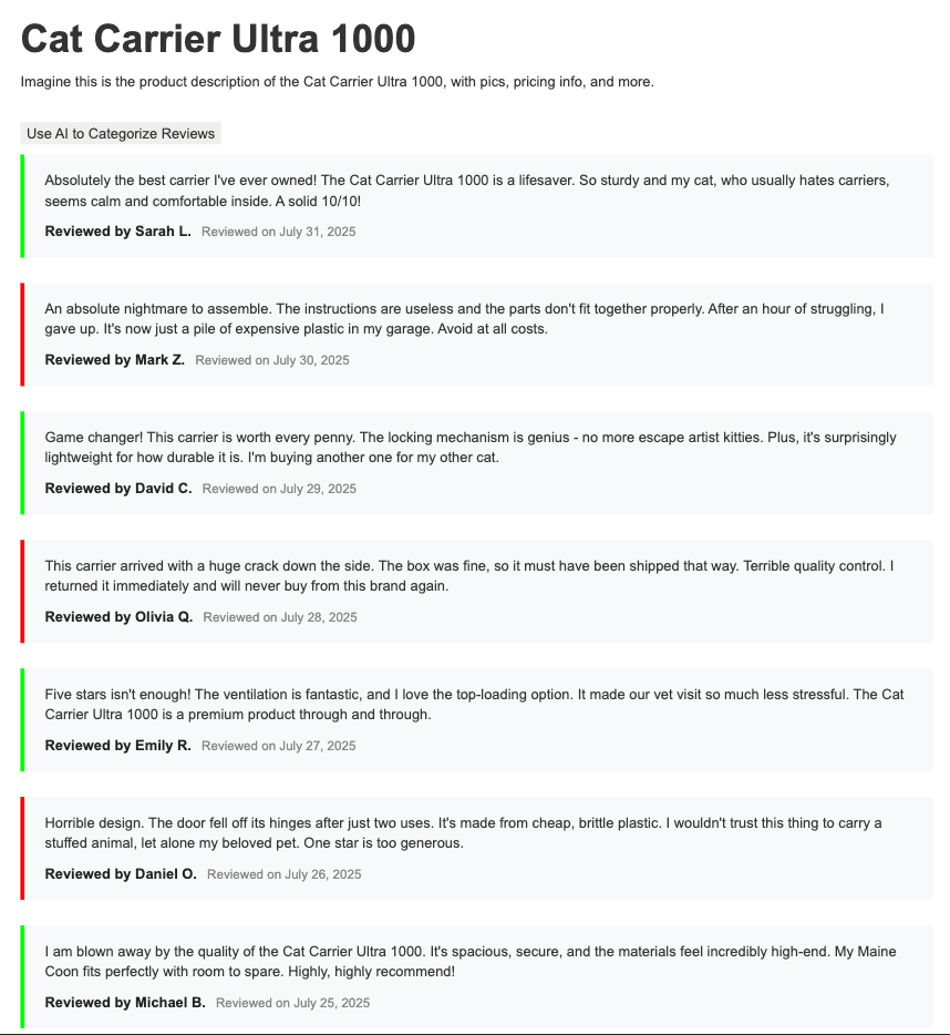 </style>The net result looks like this: the user (in a Chrome browser, for now) hits the site, and once AI support is detected, the button is added on top. After the model is downloaded (which is a one time operation for all sites), if they click, the reviews will be checked and color-coded accordingly. If you are on the latest version of Google Chrome and have enabled the proper flag, you can see this for yourself here: https://chrome-ai-test.webflow.io/review-demo-page. Of course, even if you aren't on Chrome, you can hit that URL and nothing bad will happen.