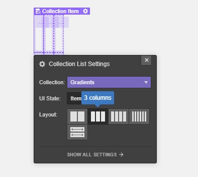 Next place a container on the canvas — no need to give it a class name. Add a CMS collection list and bind it to the Gradients Collection. Do this by selecting it from the dropdown in the collection list settings flyout. Select 3 Columns from the layout section of the flyout.