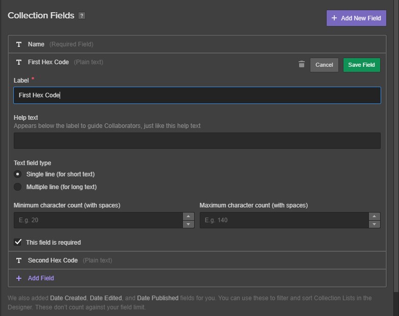 Name it “First Hex Code.” Set the field as required, by checking This field is required. Repeat this and call your new field “Second Hex Code.”