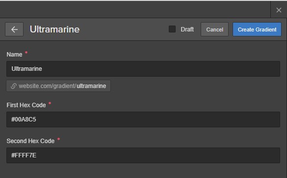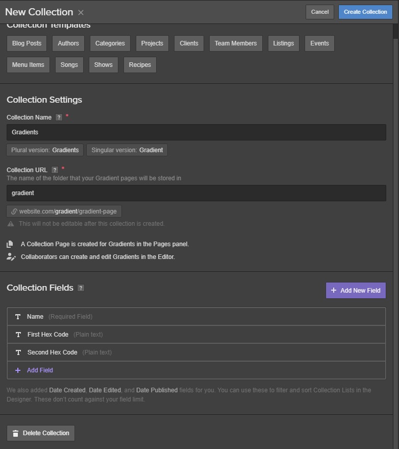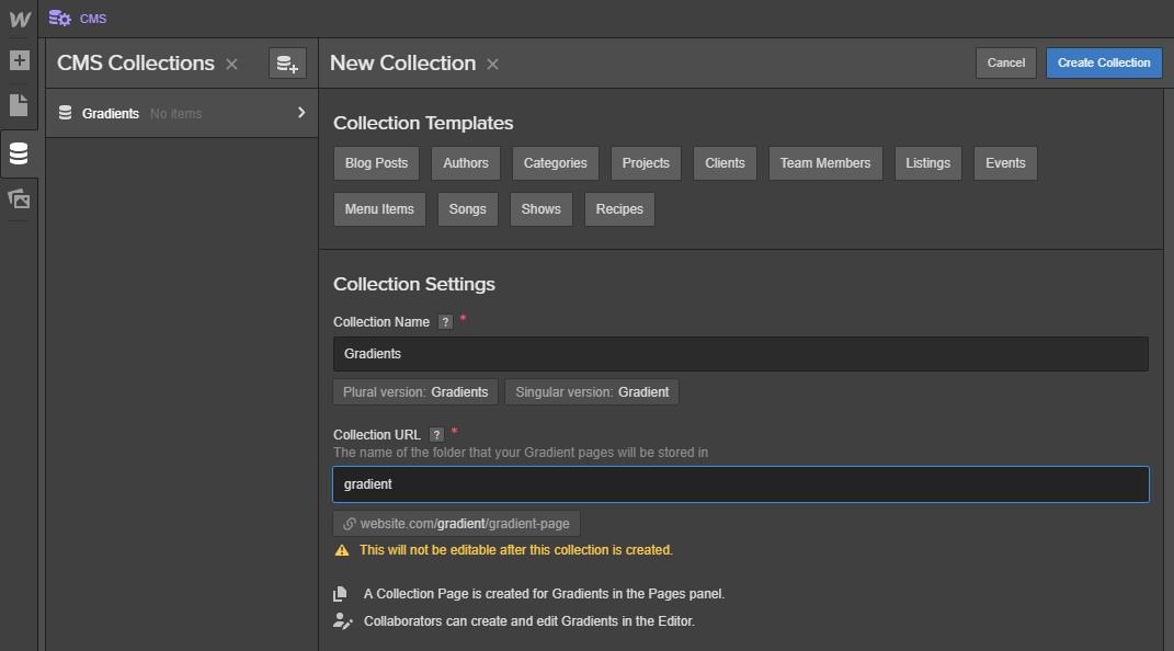 Name the collection “Gradients” and set the Collection URL as “Gradient.”