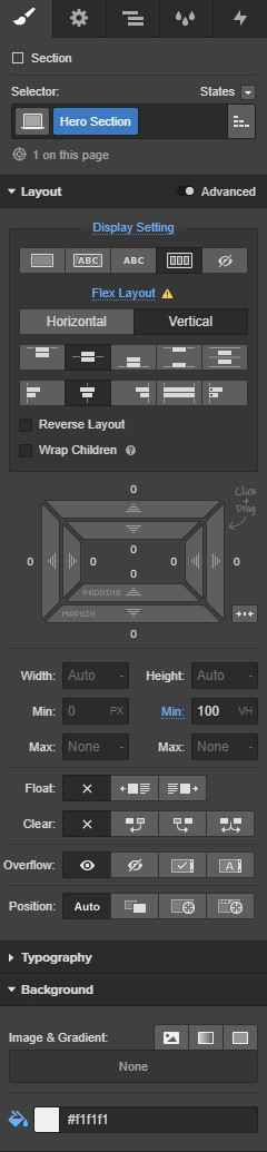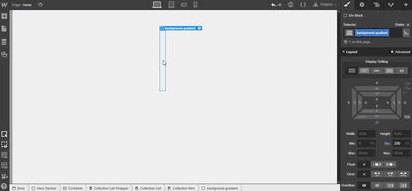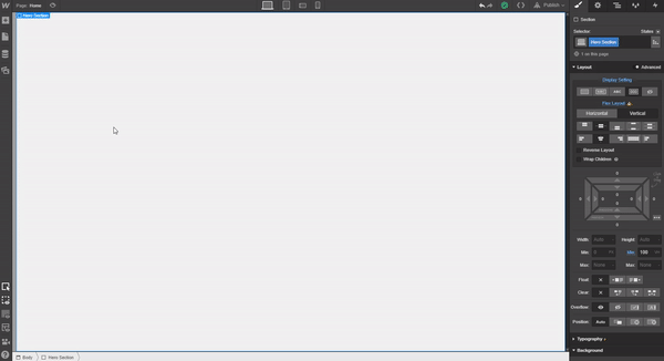 Once you’ve entered each CMS item into the collection, go to the left hand tabs panel in the designer, click on the Add Element(s) tab. Place a Section on the canvas, give it a class of “Hero Section,” and use the following settings: