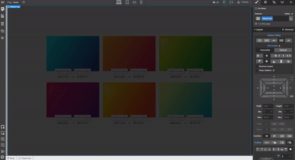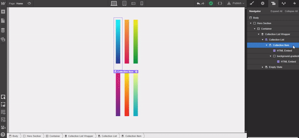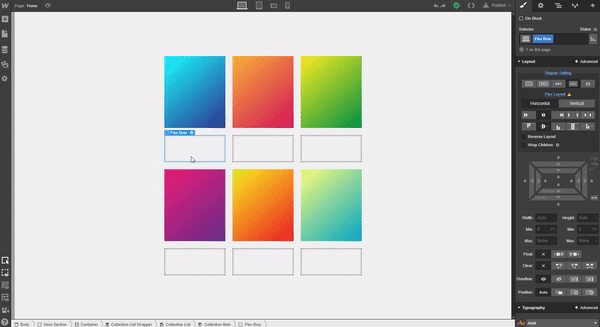 When you hit Save & Close, you’ll see the dynamic gradients fill the previously created divs. Next, add a div to the collection item container and give it a class of “Flex Row” using the following settings: