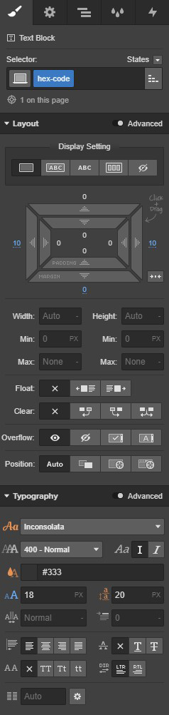 Place a Text Block in the tooltip wrapper div, give it a class of “hex-code,” and use the following settings:
