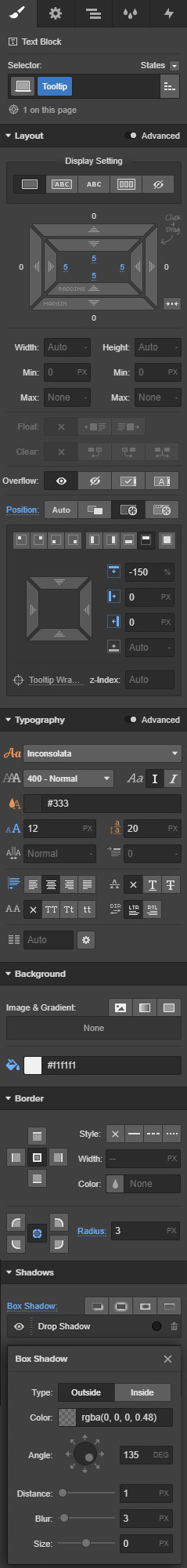 Place a new text block under the Hex Code HTML Embed, give it a class of “Tooltip” with the following settings: