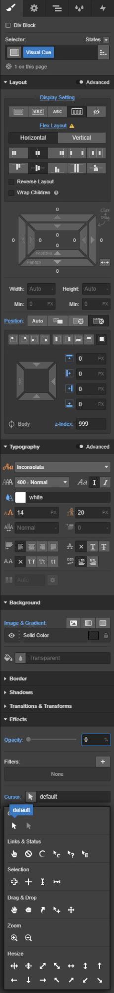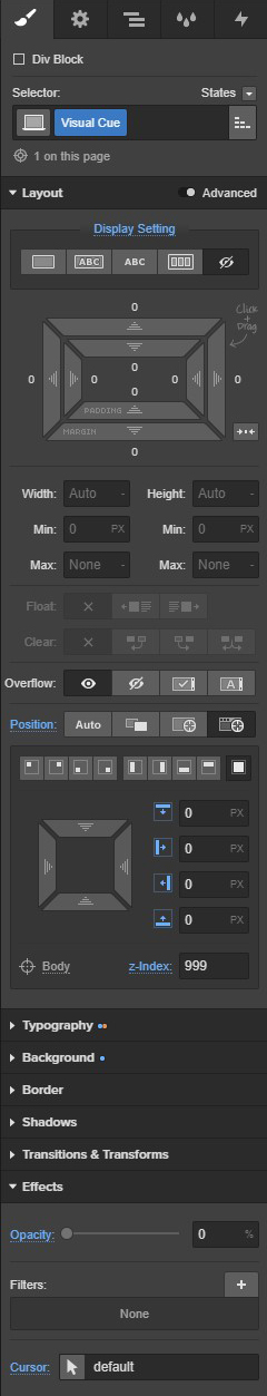 Grab a div, and place it in the body of your page and give it a class of “Visual Cue” with these settings: