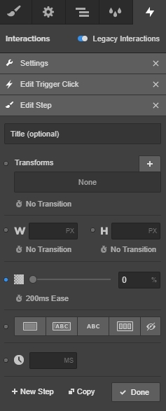 Change the opacity to 0% — again leaving the default 200ms animation time. Add one last new step.