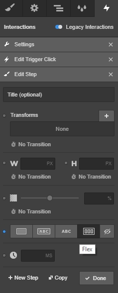Next, click the plus icon next to the First Click text. Select the display setting of Flex and click + New Step.