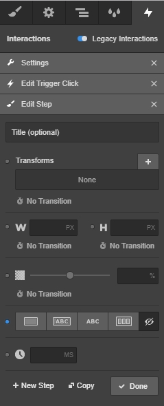 In this step, change the opacity to 100% and leave the default 200ms. Click + New Step again.