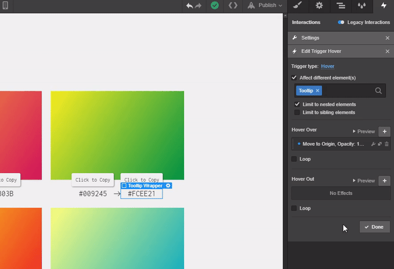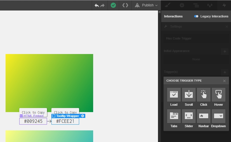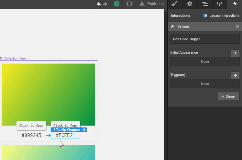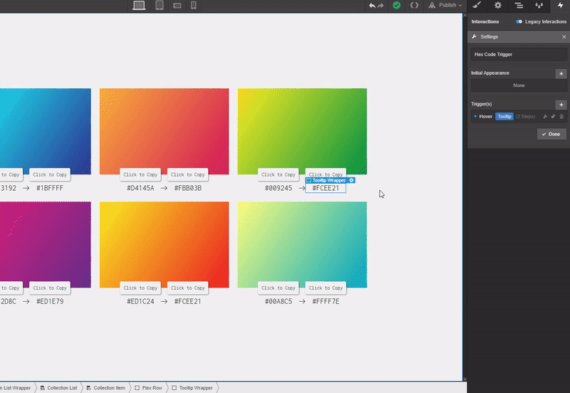 Now select the one of the tooltip wrappers, add a new interaction, and name it “Hex Code Trigger.”