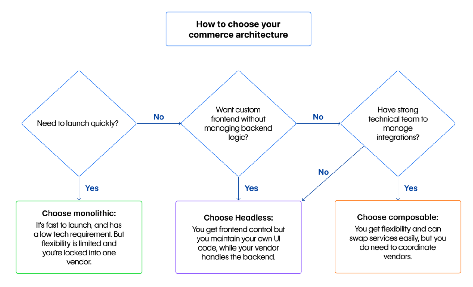 If you need to launch quickly with limited technical staff, monolithic platforms work well. If you want custom experiences but don't want to build commerce logic, headless fits. If you have the technical resources to manage complexity, composable gives you the most options.