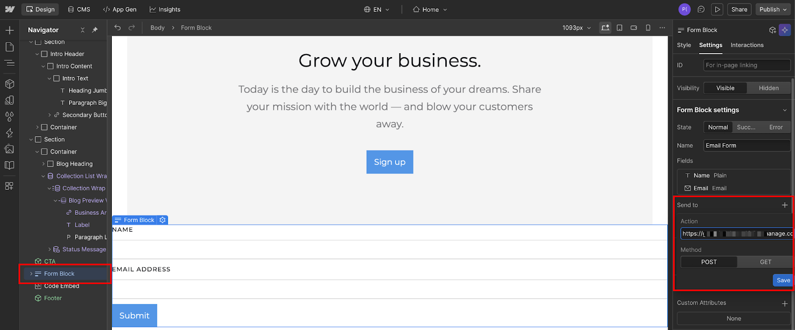 Click the form container to select it, then open the Settings panel (gear icon). Under Form Settings, change "Send to" from "Webflow" to "Custom action." A new field labeled "Action" will appear. Paste the Mailchimp subscribe URL you copied earlier. Make sure it includes https://. Omitting the protocol will break the integration.