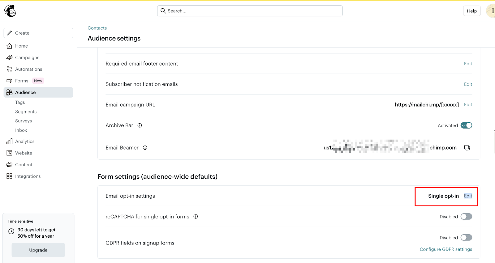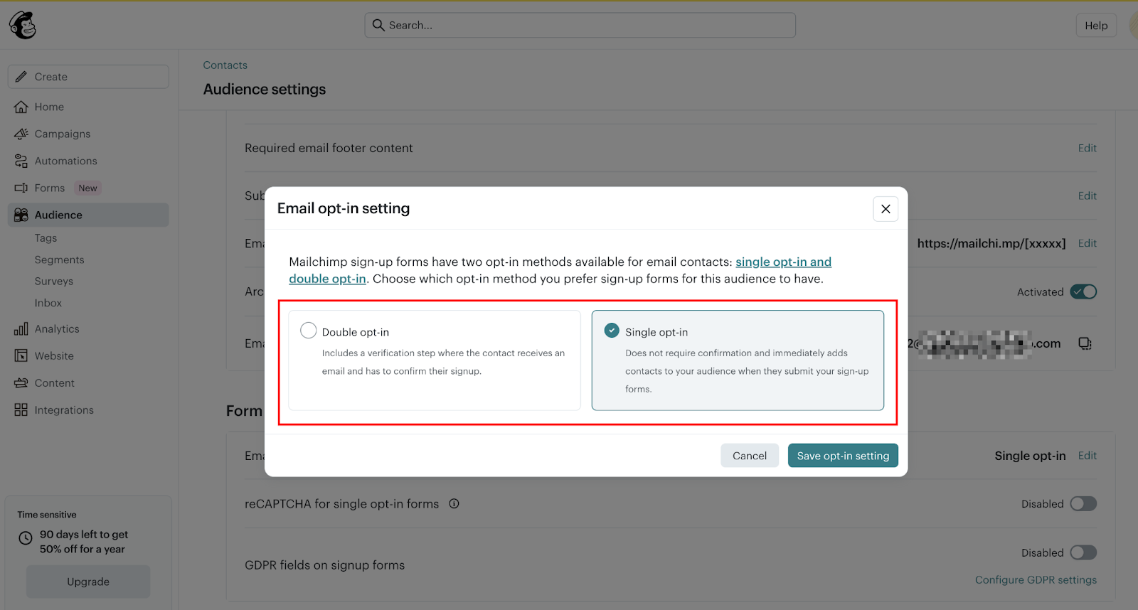 Before publishing, decide whether you want a single opt-in or double opt-in. In Mailchimp, go to Audience → Audience settings → Form settings (audience-wide defaults). Scroll to "Email opt-in settings."