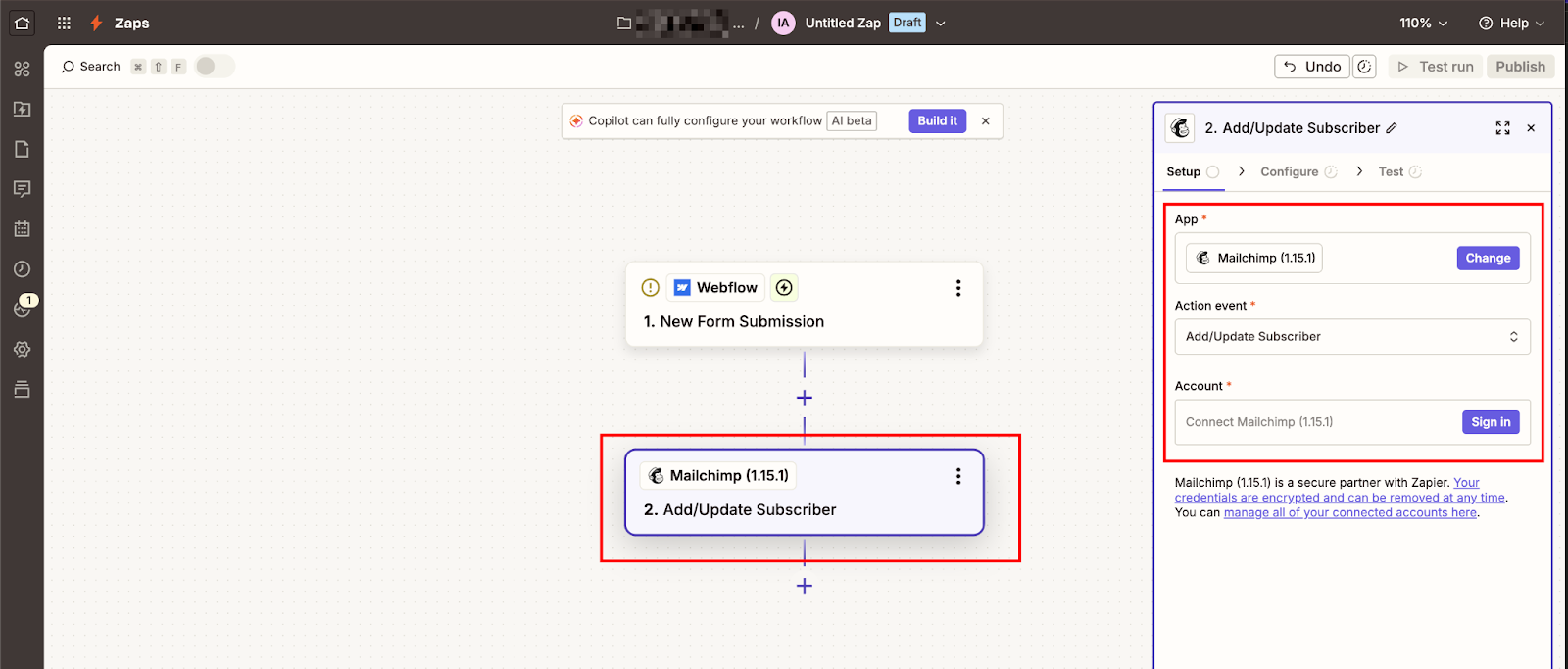 Give your Zap a descriptive name like "Webflow Newsletter → Mailchimp [Startup Tag]" so you can identify it later when you have multiple Zaps running.