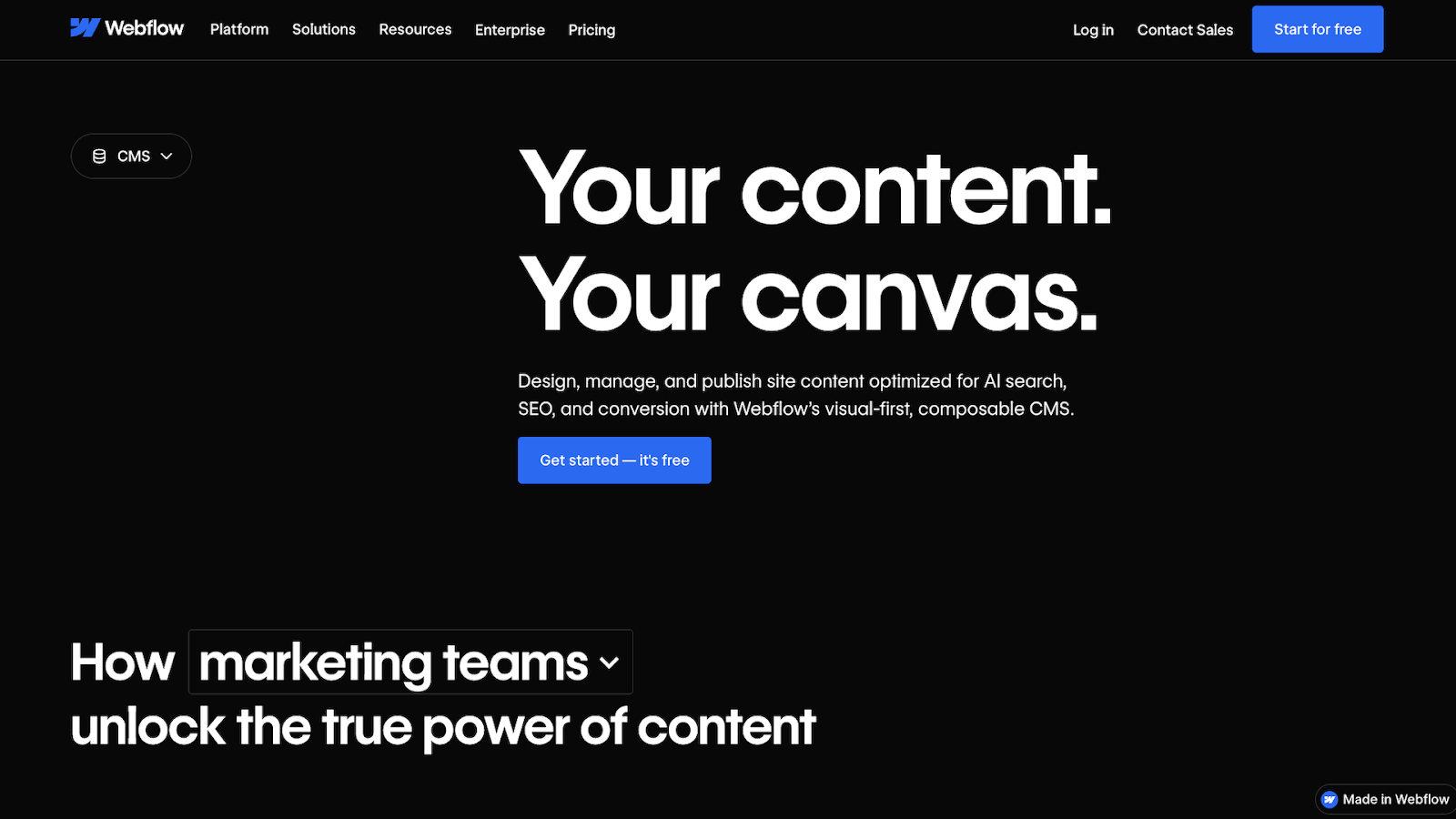 Webflow is a website experience platform, with a visual-first composable CMS that gives your team complete control over content and presentation, along with powerful search engine optimization and answer engine optimization capabilities.