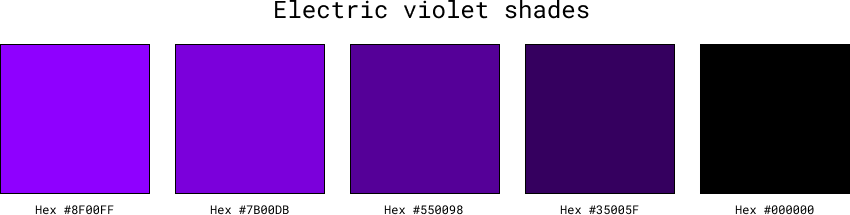 This color palette combines analogous colors with their respective monochromatic tints and shades, giving us fifteen different colors that all look great together, again centered around electric violet.