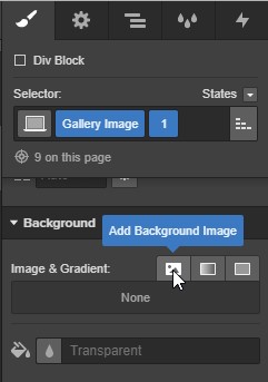Now you’ll have a div block that spans the entire width of the Gallery container, but it has no background image. Since I’m not building this with dynamic content pulled in from the CMS, I’ll be adding an additional combo-class to each “Gallery Image” div block so I can add a unique background image to each item.