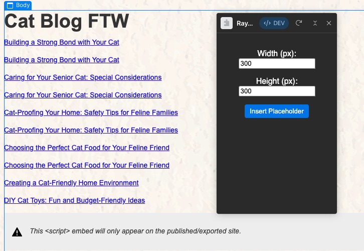 Once I've verified the inputs and the user selects a rich text block, I can add a new item to the page. I'm inserting a generic DOM element which gives me the power to select any particular tag. I set the tag to img and then specified the URL using the documentation from PlaceCats.com.