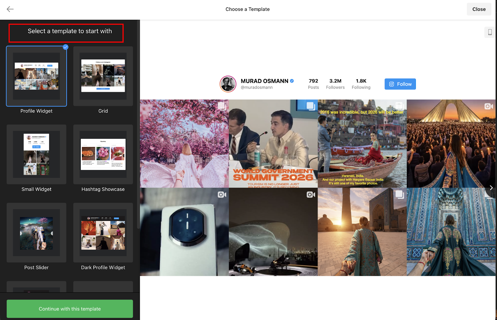 Pick the template that matches where you're placing the feed. For homepage hero sections, I can say the slider works. For portfolio pages, grid. For blog sidebars, cards with a header.