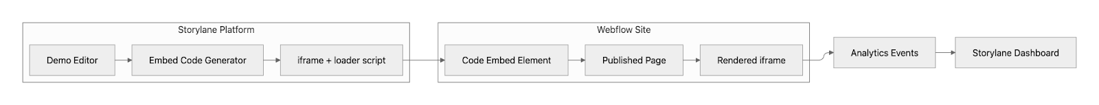 The data flow follows this sequence: configuration in the Storylane editor, embed code with an iframe and the storylane.js script, Webflow renders the iframe on published pages, and analytics data is returned to theStorylane dashboard.