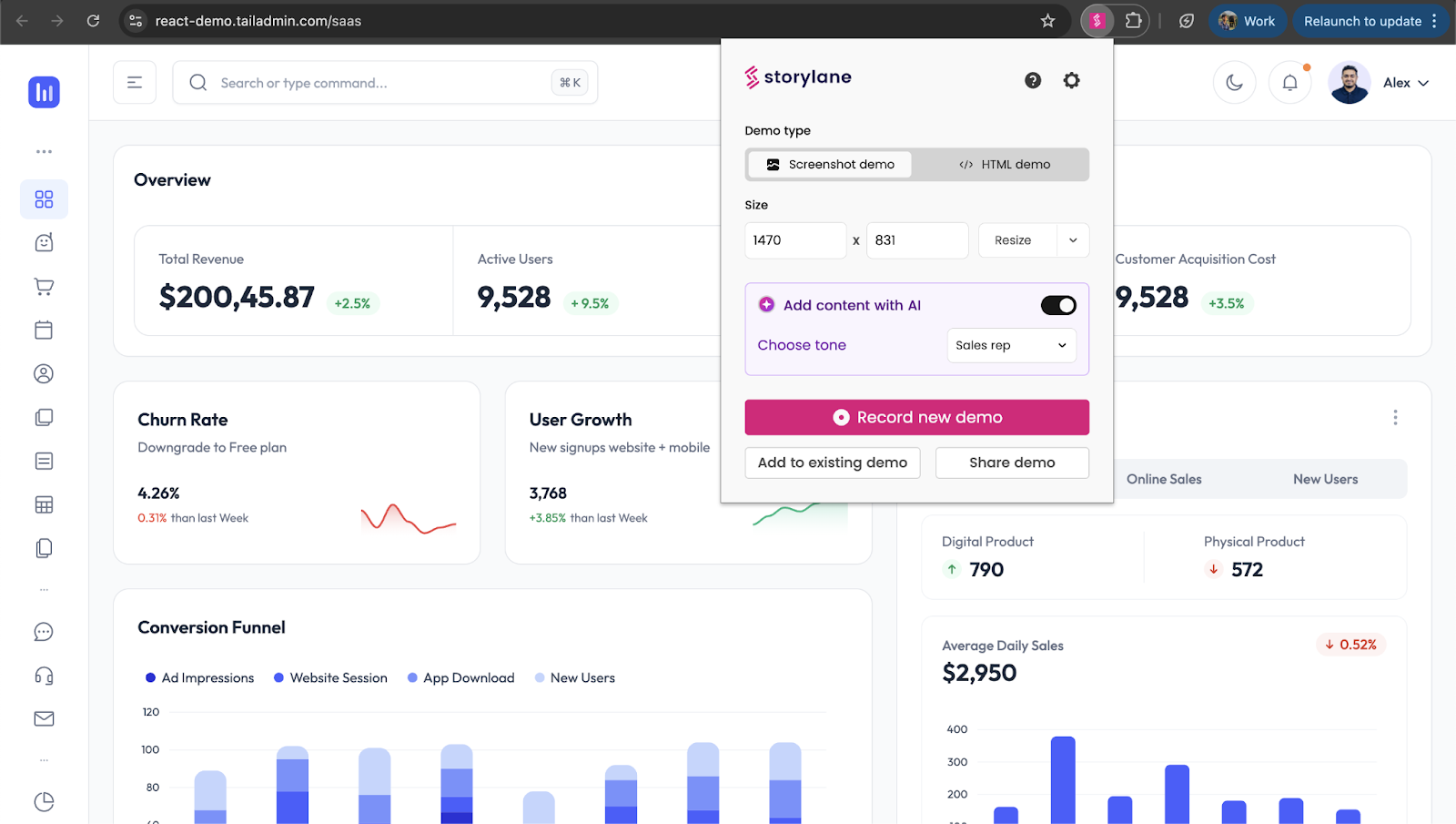 Storylane captures engagement data automatically through a three-tier system covering global metrics, single demo analytics, and session-level data.