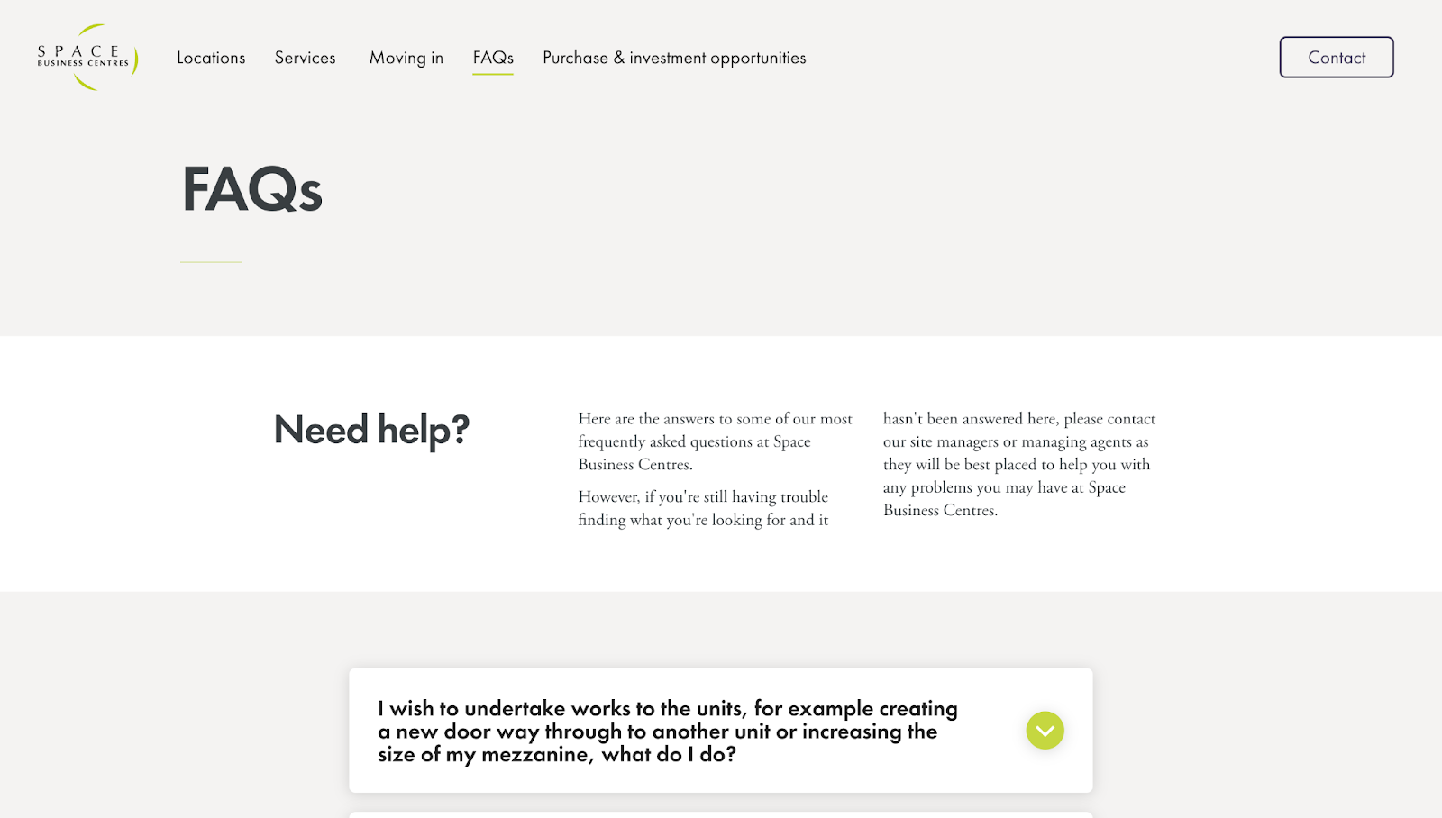 Space Business Centres’ FAQ, designed by Crafted, has an accordion-style layout that lists every question upfront, with bright green chevrons acting as obvious “click to expand” prompts. The answers are specific, including concrete details such as phone numbers, fee amounts, and notice periods. There are also embedded next-step links and forms for questions that the FAQ doesn’t fully answer.