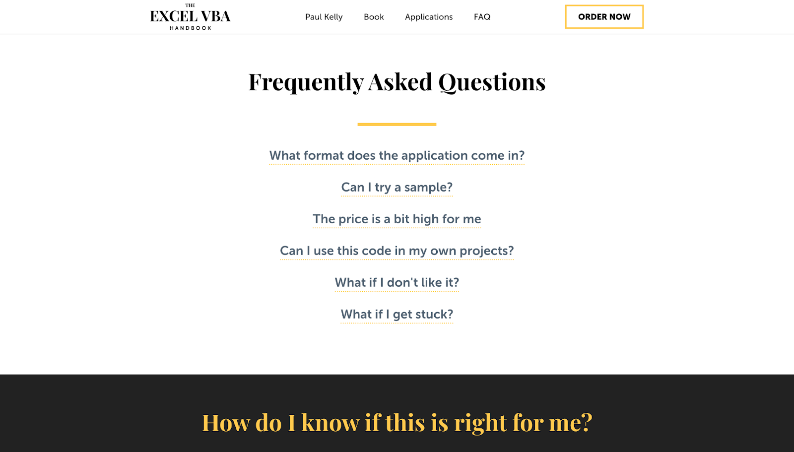 The Excel VBA Handbook’s FAQ section not only answers questions — it also nurtures leads. Designer Dmitry Kravchenko framed each question like a real search query, using plain and first-person language. The questions are highly readable, and the answers are direct but use a confidence-building tone that encourages visitors to try the product (e.g., “If you really get stuck, we can even do a Skype call.”)