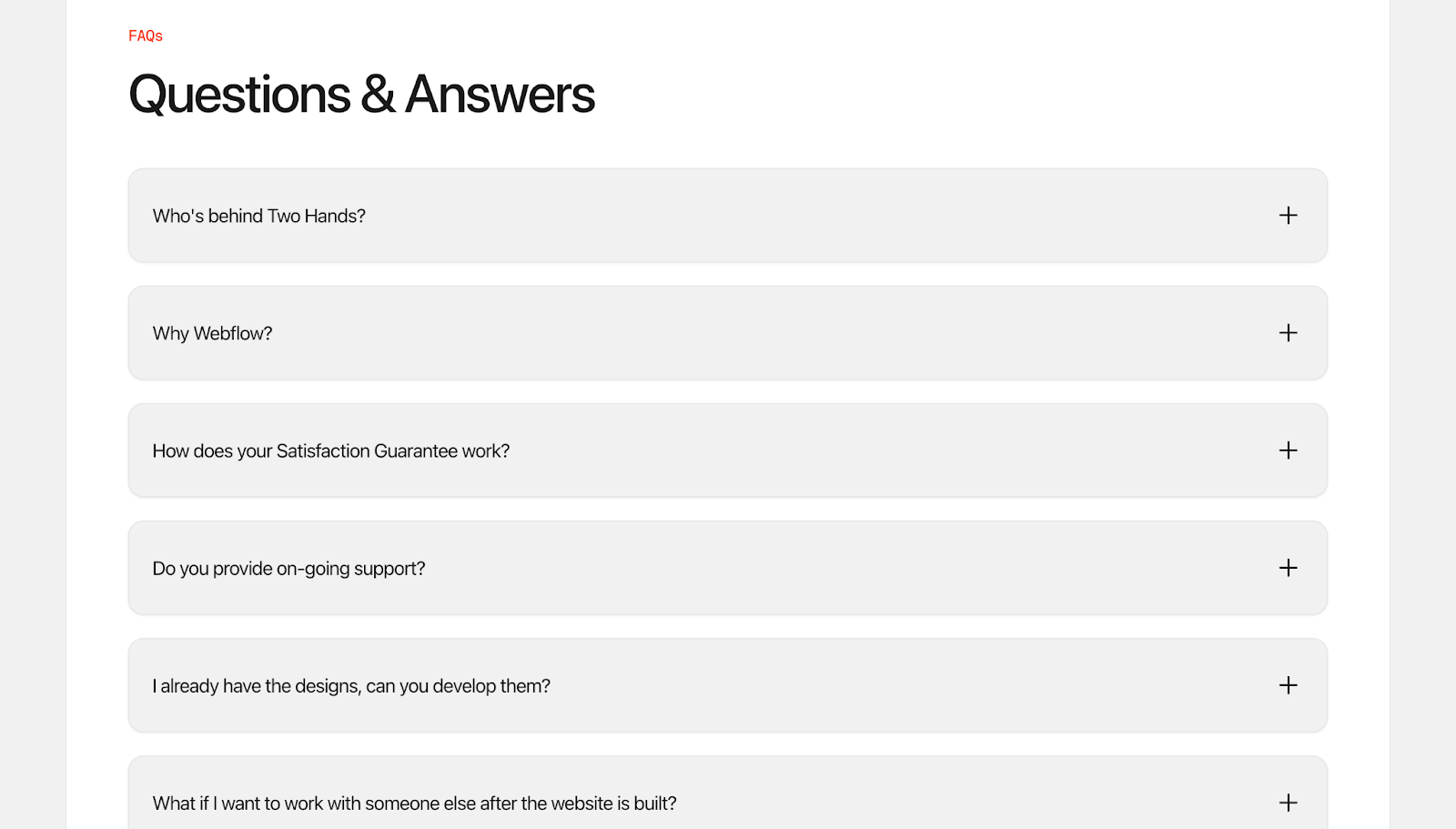 A prominent plus sign tells visitors what’s clickable, and the answers are concise but thorough, with links to additional information. This simple but effective design reduces follow-up questions and supports fast page loading while keeping the content SEO-friendly.