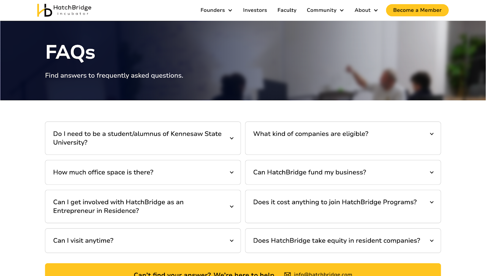 At the bottom, a contrasting yellow bar labeled “Can’t find your answer? We’re here to help.” stands out, giving people a clear way to get in touch if the FAQ didn’t answer their concerns. An email address and a phone number make HatchBridge’s support readily available through multiple channels.