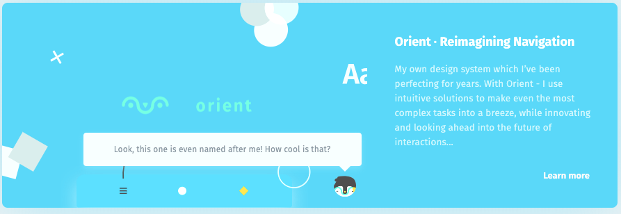 Rodolfo Sarno is a user interface designer whose portfolio is more than just a collection of projects — it’s a showcase of swirling, surreal animations. A bouncing orb cursor leads you through his site, with a hover animation shaking the surface of each project like a marble dropped in water.