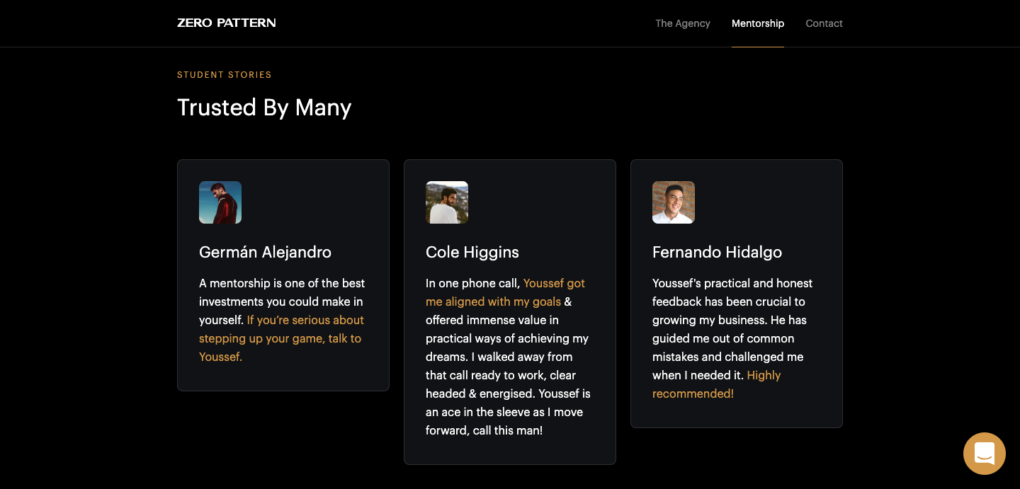 ZERO PATTERN is a business with two distinct parts — a design agency and a web design mentorship program. The site design, with its blacks and golden yellows, almost feels like a luxury brand. And for both sides of this business, it’s an aesthetic that’s bold and builds trust.