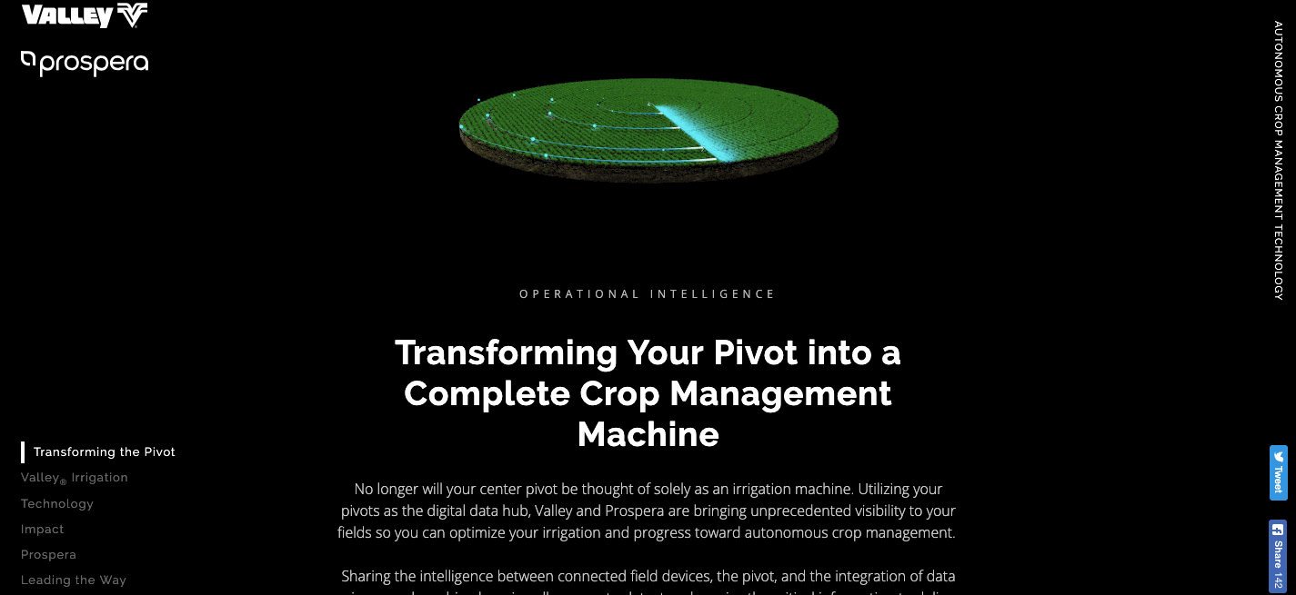 The agricultural tech company Valley Prospera is a good example of this. They have a focus on reinventing how irrigation works.
