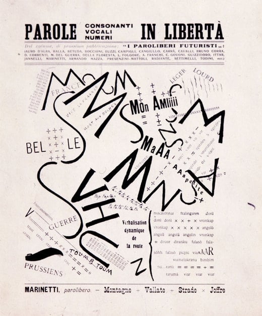 To see parallelism in action, I can’t think of a better example than Italian Futurist F.T. Marinetti’s classic visual poem “Parole in liberta” (“Free words” or “Words in liberty”).