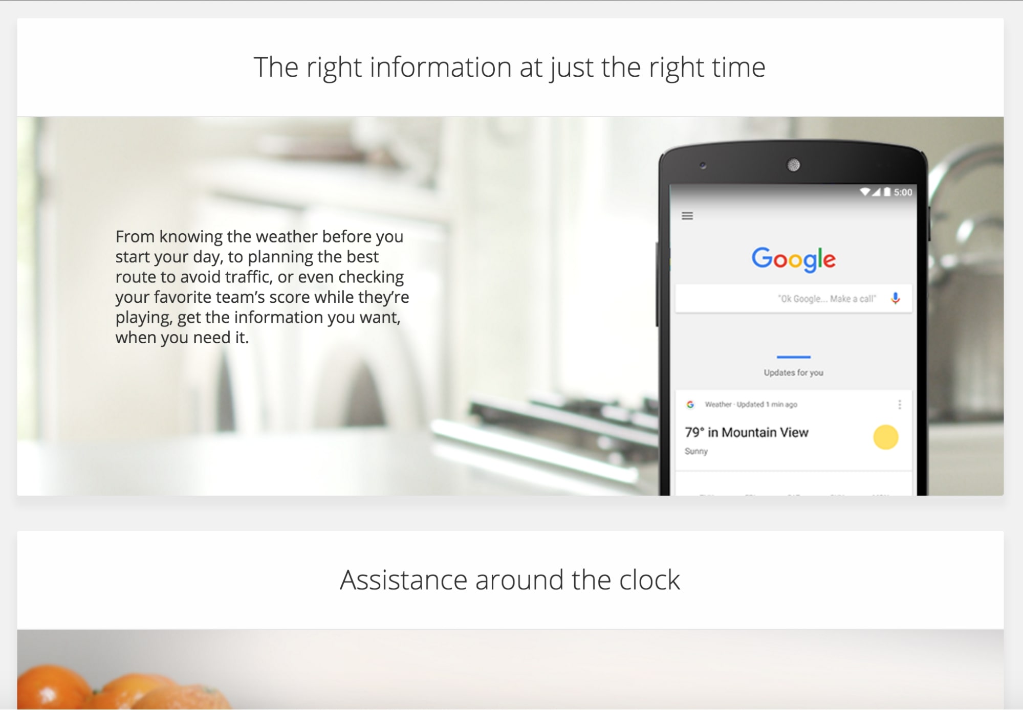 In the screenshot above (taken from Google’s Now site), the designer uses giant cards to help us understand that the headline, image, and paragraph are all related. We immediately get that “The right information at just the right time” defines the topic of both the image and the copy below and that “Assistance around the clock” is introducing a new group of elements.