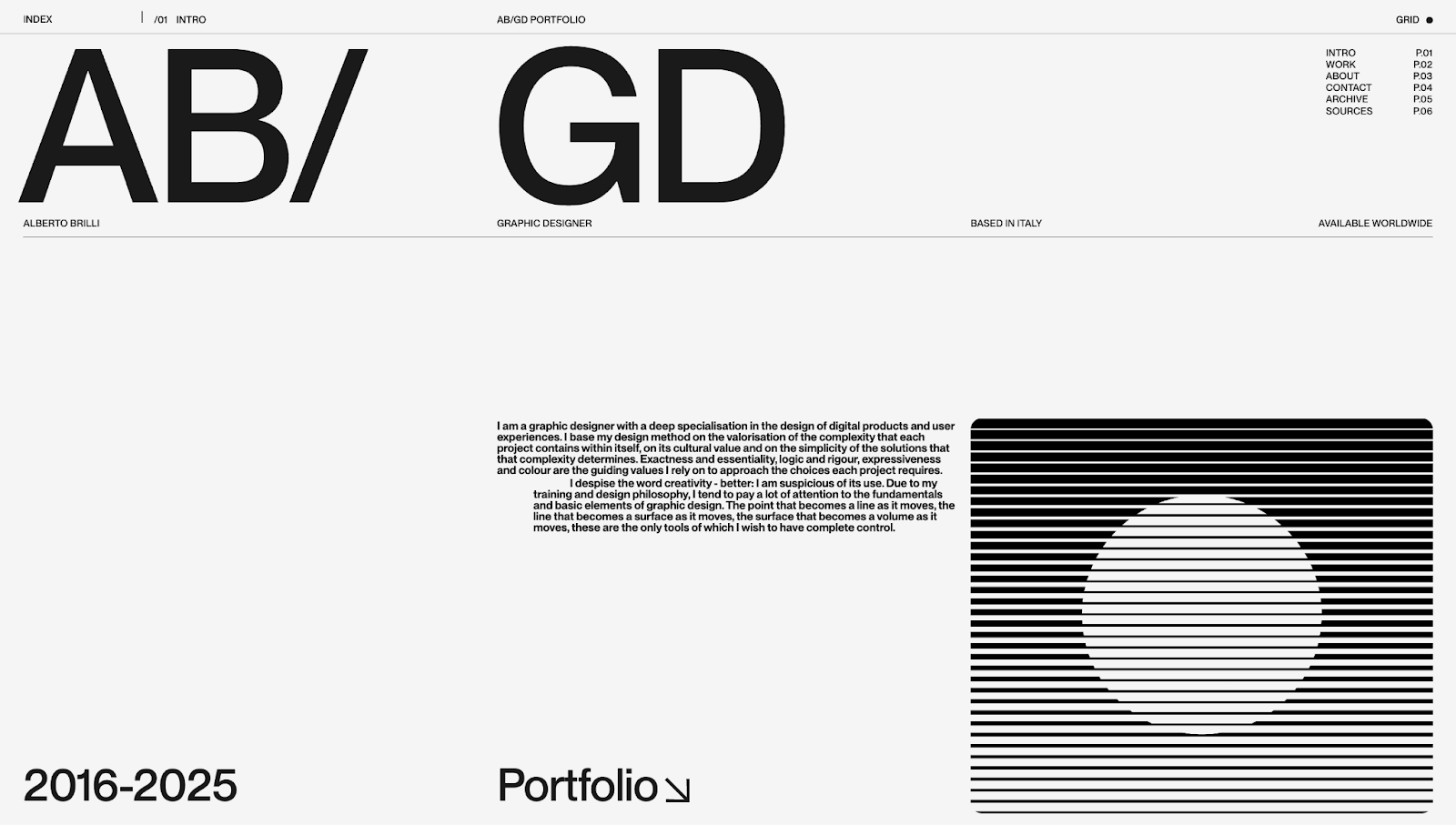 The monochrome aesthetic matches much of the past work’s branding, but the designer’s identity shines through statements like “Exactness and essentiality, logic and rigour, expressiveness and colour are the guiding values I rely on to approach the choices each project requires.” Messaging like this takes the portfolio beyond projects, showing what the human behind the site is like to work with.