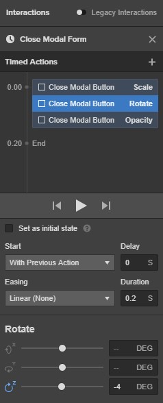 - Rotate, set to start with previous action, linear easing, 0.4s duration, Z set to 0°