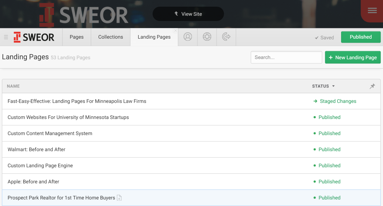 The CMS’ core functionality comes from the Collections tab. Your landing pages are simply another Collection. It behaves just like your blog. The only difference is that it isn’t accessible from your website, but points people to it.