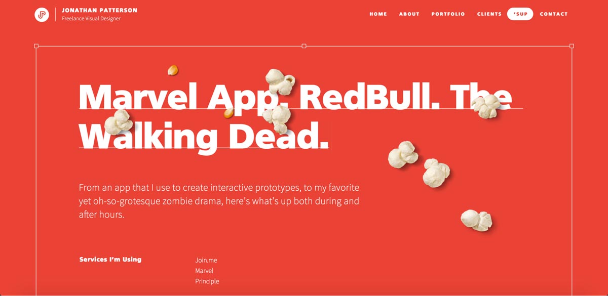 There are all kinds of things to love about Jonathan Patterson’s standout portfolio, but today I’m going to fanboy a bit over the huge headlines you find on all the non-portfolio pages of his site.
