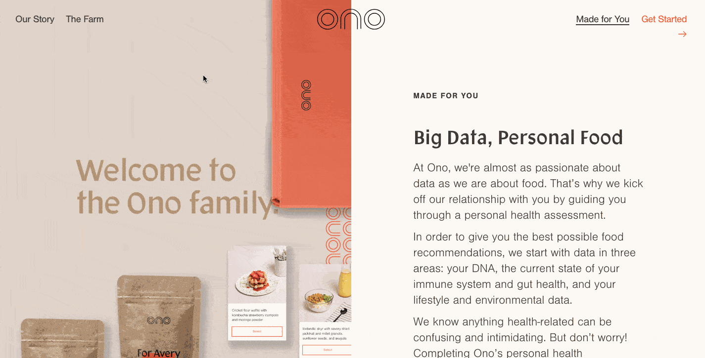 Food kit company Ono uses split screens with scroll-triggered animations for a UX full of color and movement. This creates a clear path to the eventual call-to-action (CTA) at the bottom of both columns, as site visitors must continue scrolling to read the text on the right side of the screen. As they scroll, new visuals emerge on the left to add variation and prevent readers from growing bored.