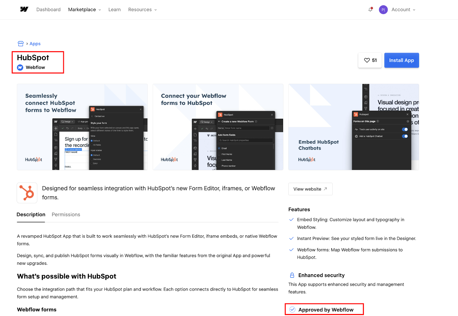 Verify it shows "Approved by Webflow" and "Enhanced security" badges to confirm you're installing the certified integration rather than a third-party alternative.