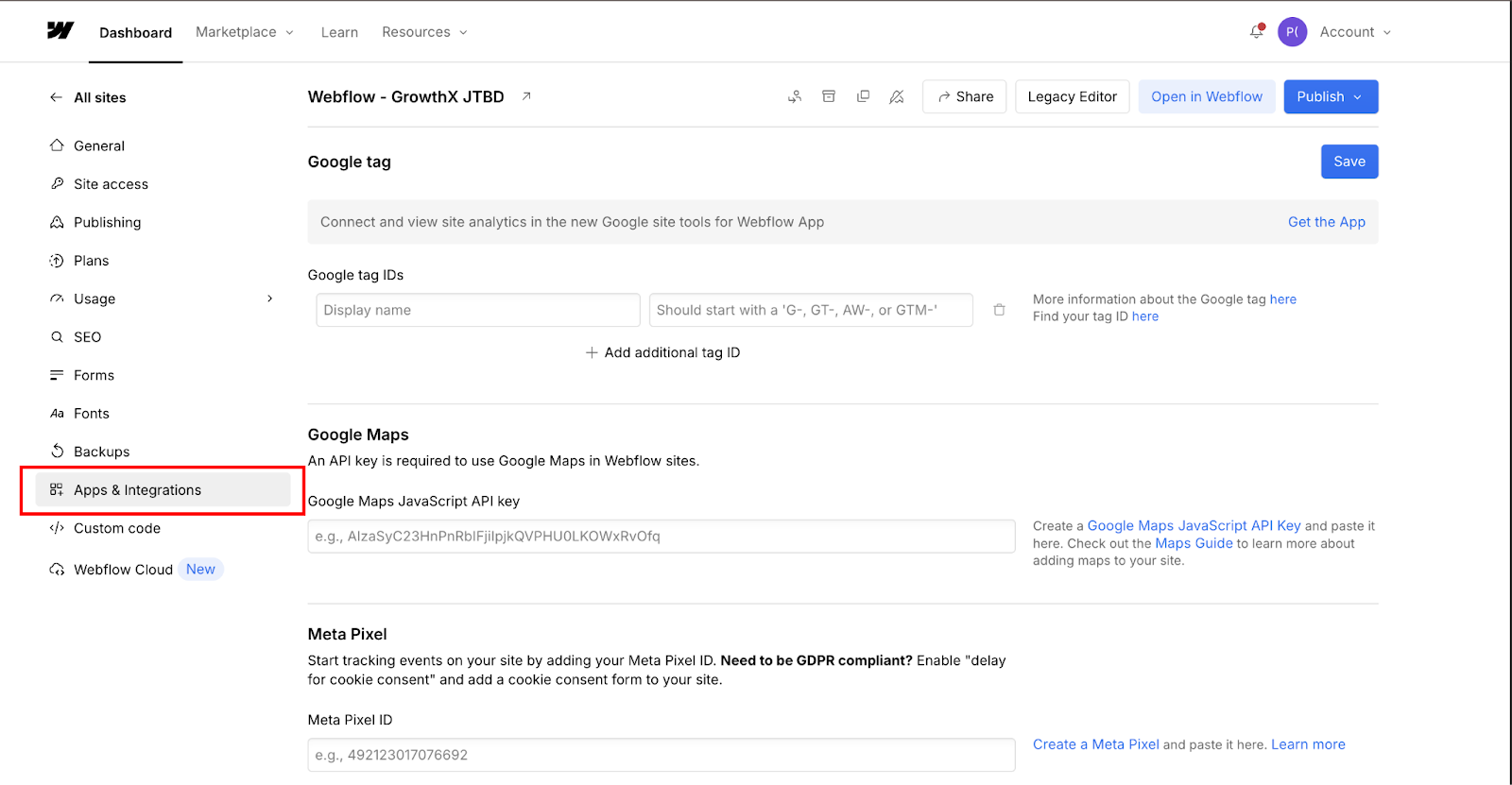 Switch back to Webflow and open your project in the Designer. Navigate to Site Settings (found in the left sidebar or top-left project menu). Click the Custom Code tab to open panels for site-wide code injection.