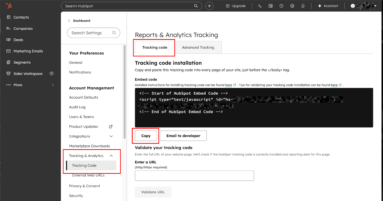 Return to HubSpot Settings (gear icon) and navigate to Account Management → Tracking & Analytics → Tracking Code in the left sidebar. You'll see your unique tracking code displayed in a code block. This JavaScript snippet is specific to your HubSpot account and contains your portal ID.